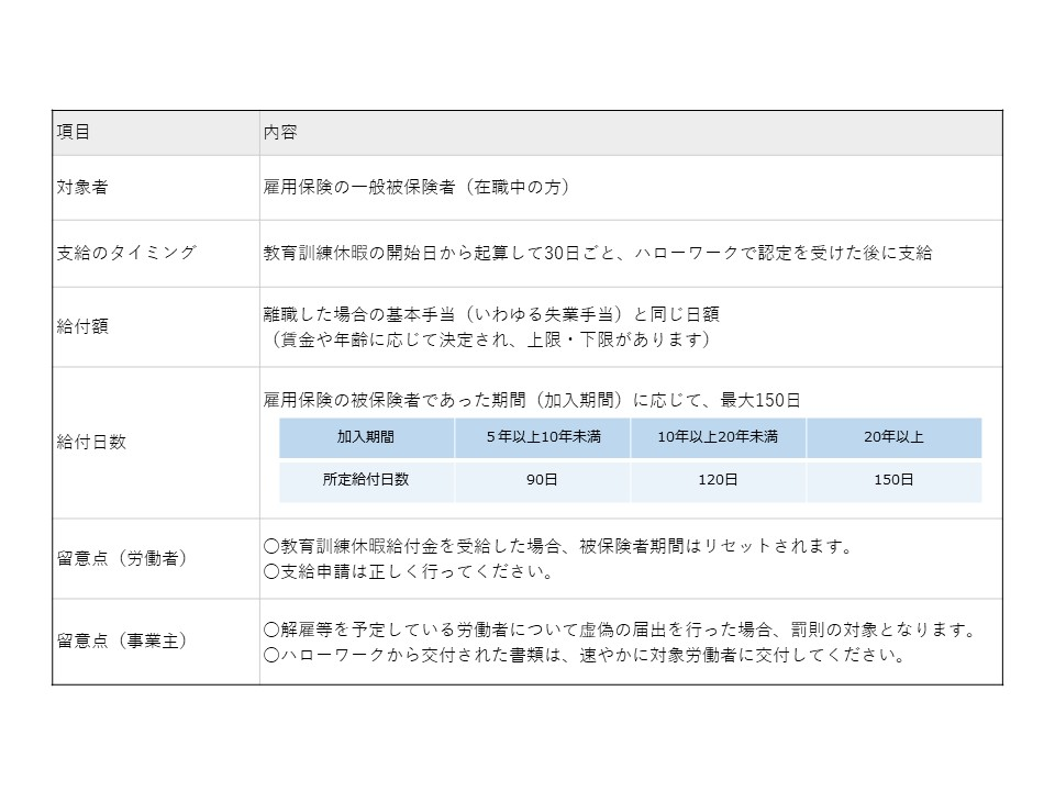 労働者が離職することなく教育訓練に専念するため、自発的に休暇を取得して仕事から離れる場合、失業給付(基本手当)に相当する給付として賃金の一定割合を支給することで、訓練・休暇期間中の生活費を保障する制度です。